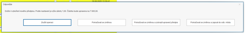 - Pokud nenalezne dle VS, vytvoří nový zálohový předpis. Pokud souhlasí částka, rovnou zaúčtujte. Pokud nesouhlasí, nabídne úpravu částku na zálohovém předpisu.